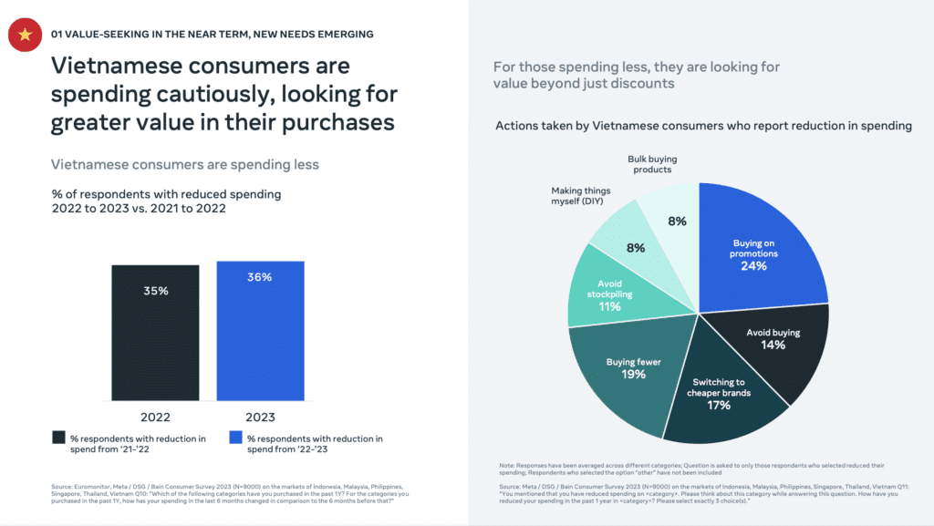 Người tiêu dùng ở Việt Nam đang ngày càng chi tiêu thận trọng hơn và tìm kiếm giá trị cao hơn trong các khoản mua sắm của họ. Họ tập trung vào việc mua sắm trong các chương trình khuyến mãi, chuyển sang các thương hiệu rẻ hơn và tránh tích trữ hàng hóa. Các danh mục chi tiêu như rượu và kỳ nghỉ bị cắt giảm, trong khi thực phẩm, chăm sóc cá nhân và sức khỏe vẫn giữ được sự bền vững.