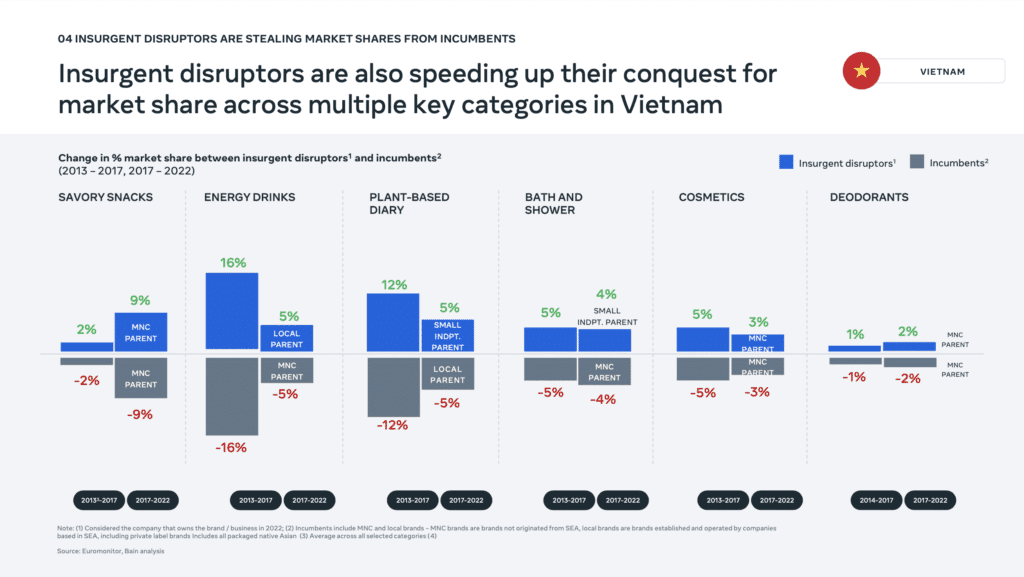 Các công ty khởi nghiệp ở Việt Nam đang nhanh chóng chiếm thị phần từ các công ty cũ bằng cách đáp ứng các nhu cầu chưa được đáp ứng của người tiêu dùng và tận dụng các kênh trực tuyến. Họ đang tận dụng sự linh hoạt và khả năng đổi mới để tạo ra các sản phẩm và dịch vụ phù hợp với xu hướng tiêu dùng mới.