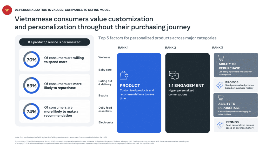 Người tiêu dùng Việt Nam đánh giá cao cá nhân hóa trong suốt hành trình mua sắm của họ. Các doanh nghiệp cần tinh chỉnh mô hình của mình để cung cấp các trải nghiệm mua sắm cá nhân hóa, từ đó tăng cường sự gắn kết và lòng trung thành của khách hàng.