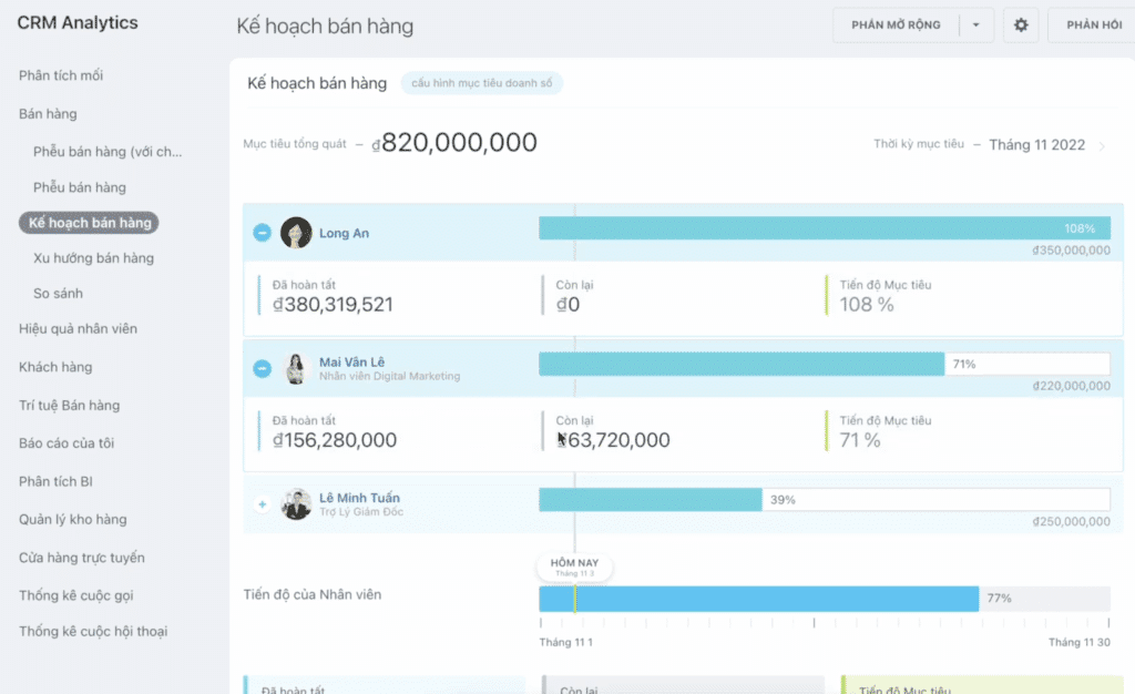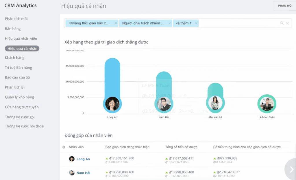 - Theo dõi hiệu suất nhân viên: CRM giúp quản lý cấp trung theo dõi hiệu suất của từng nhân viên, từ việc theo dõi số lượng cơ hội bán hàng đến tỷ lệ chuyển đổi. Điều này giúp họ tạo ra kế hoạch đào tạo và phát triển phù hợp.