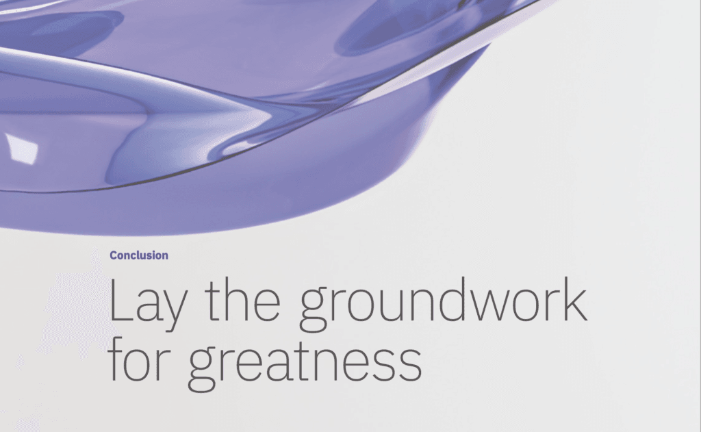 Tài liệu này kết thúc bằng việc nhấn mạnh tầm quan trọng của sự lãnh đạo, sự kiên định và quyết tâm trong mọi sự chuyển đổi. Các CEO cần áp dụng những phẩm chất này để phát triển những con người am hiểu về AI, hoạt động AI và tận dụng dữ liệu và công nghệ do AI cung cấp. Các CEO không nên để người khác kiểm soát những gì định nghĩa và phân biệt tổ chức của họ, hãy thử nghiệm các use case và mở rộng quy mô một cách nhanh chóng và có trách nhiệm. Không tổ chức nào có thể tự mình thực hiện điều này, IBM khẳng định họ có nhiều kinh nghiệm để giúp khách hàng định hướng những điều chưa biết. Các chương tiếp theo vẫn đang chờ được viết.